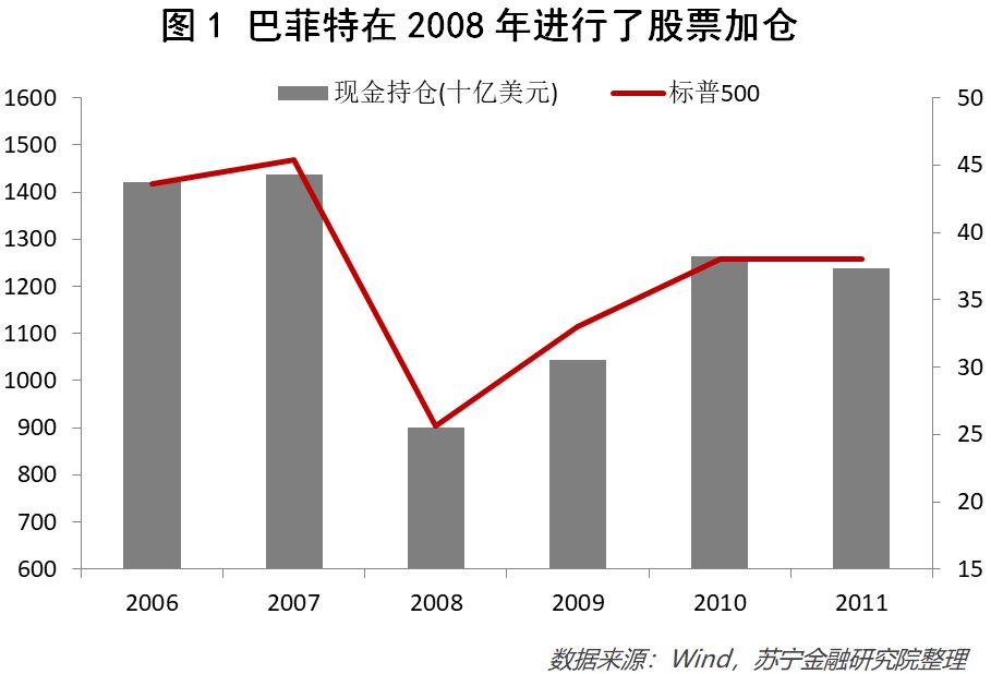 这也就是巴菲特说的“在别人恐惧时贪婪”。以巴菲特组合中的现金持仓为例,在2008年金融危机时,巴菲特进行了明显的加仓,导致其组合中现金持有量出现了大幅的下降(参见图1)。