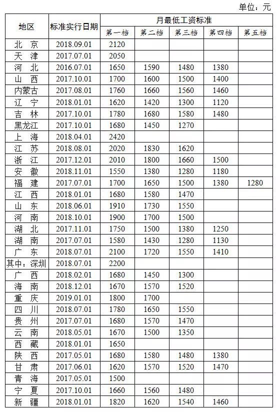 最新全国31省份最低工资标准出炉。人社部网站近日公布全国各地区月工资、小时最低工资标准情况(截至2019年3月)。上海、北京、广东、天津、江苏、浙江这6省份最低工资标准超过2000元,其中上海月最低工资2420元为全国最高。此外,北京小时最低工资标准为24元,居全国之首。