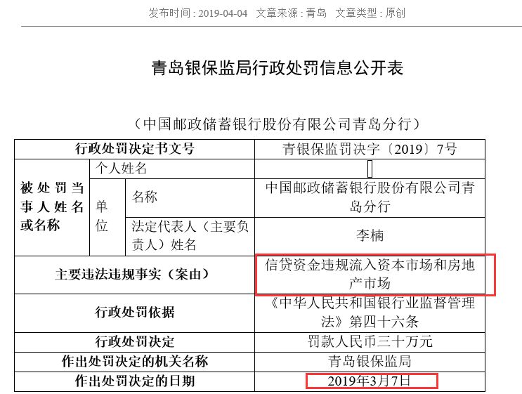 因信贷资金违规流入资本市场和房地产市场,平安银行青岛分行和中国邮政储蓄银行青岛分行各自领到一张罚单。