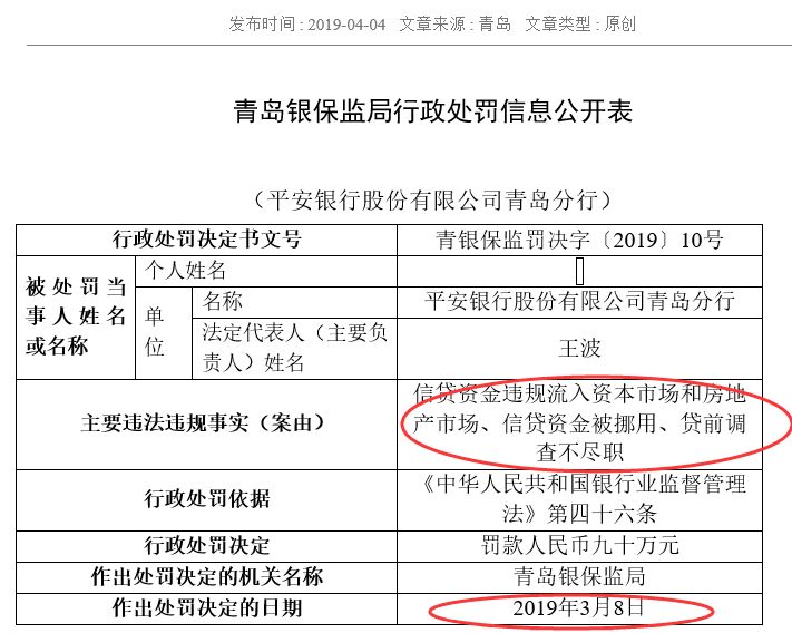 4月4日,青岛银保监局发布的行政处罚决定显示,平安银行青岛分行因信贷资金违规流入资本市场和房地产市场、信贷资金被挪用、贷前调查不尽职,被罚90万元。青岛银保监局作出处罚的时间为2019年3月8日。