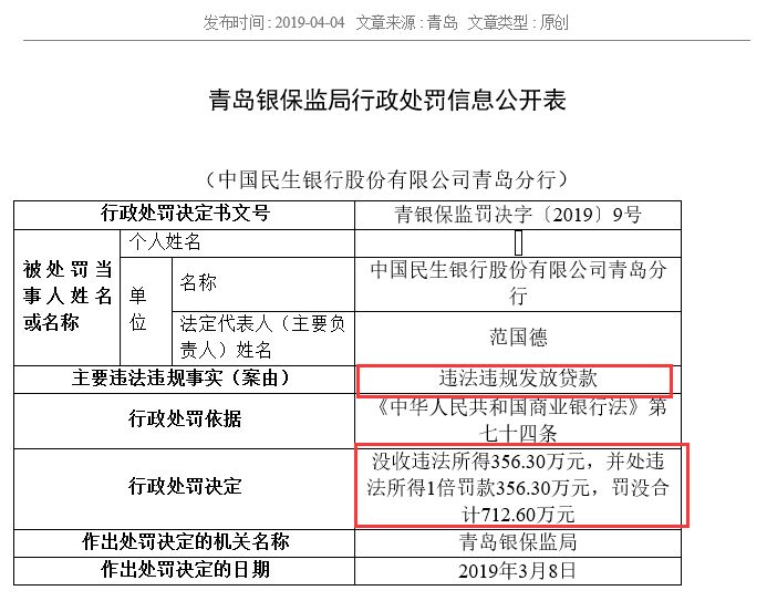 4月4日,在青岛银保监局同期披露的罚单中,就包括另外一张信贷业务违规的罚单。中国民生银行青岛分行因违法违规发放贷款,被没收违法所得356.30万元,并处违法所得1倍罚款356.30万元,罚没合计712.60万元。