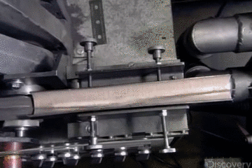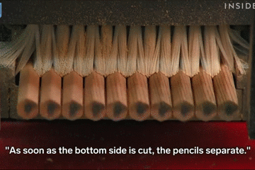 接下来就是切割这些已经装好笔芯的木板了。铅笔一般是六边形的,会做成这样的形状主要是方便人的手可以完美地握住它。除此之外,六边形可以防止铅笔随意滚动,也能更好地节约原材料。