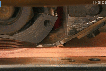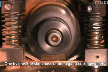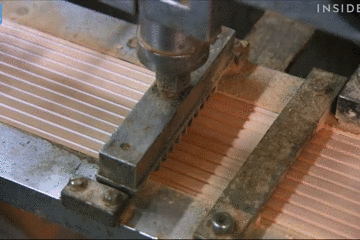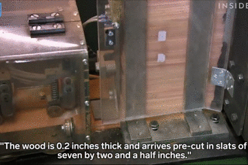 接下来,就是切这些木板,把它们中间切出个凹槽。每一块木板都要一一通过大的切割齿轮,速度很快,小心看花眼。