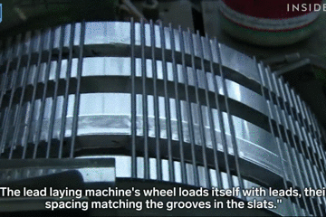 这些笔芯已经被机器安排的明明白白,一根石墨笔芯对准一个机器凹槽,就等着被放到另一拨的木板上了。