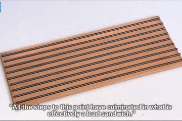 此时,刚刚涂上了胶水的那一拨木板要出场了。接下来就是见证奇迹的时刻,把涂好了胶水的木板和放好石墨笔芯的笔芯按压在一起。