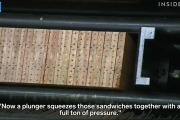 工厂会先把木材切割成这样小块,每一块木板的厚度刚好是一根铅笔的一半厚,大约0.5厘米。
