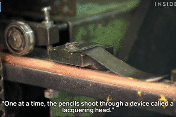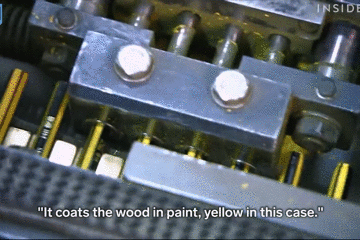 接下来,一些包装较花哨的铅笔会被送去上漆,比如你想要黄色的铅笔,就涂上黄漆,上完色后制造厂商会在一根根铅笔上印上自己的标签。