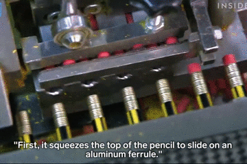 等等,这还没完,有些铅笔后面会配有橡皮擦,这些也是由机器完成。在铅笔的一端直接按上铝制金属凹槽壳。