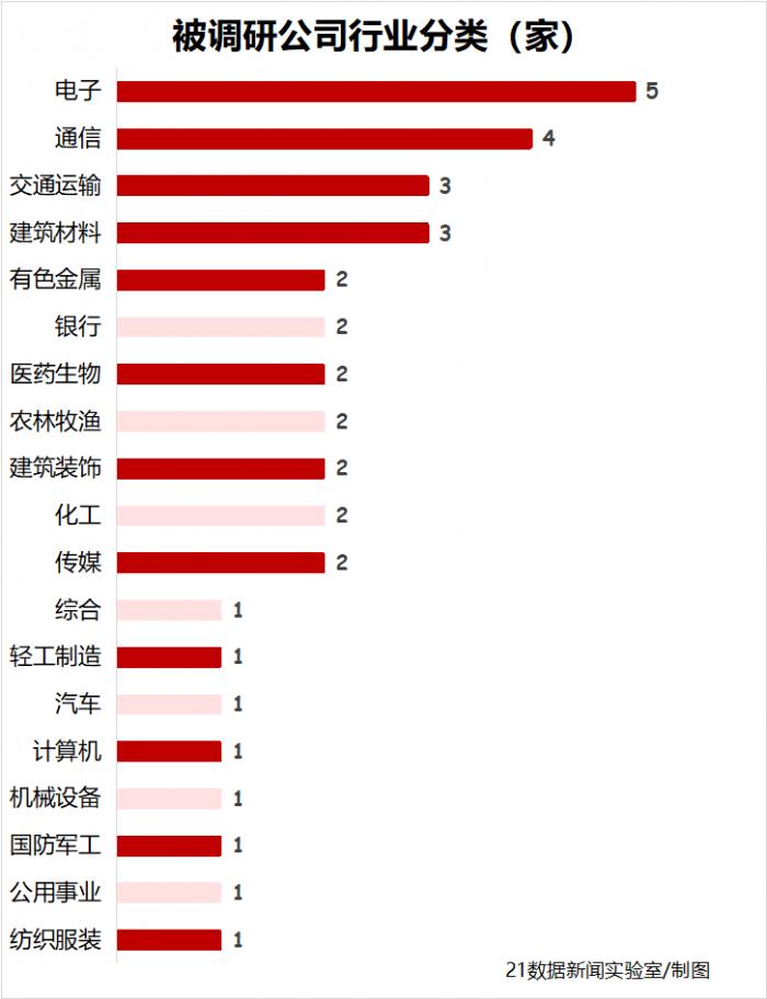 从行业分布来看,本周电子行业最受青睐。沪电股份(002463.SZ)、工业富联(601138.SH)、莱宝高科(002106.SZ)、和而泰(002402.SZ )、中颖电子(300327.SZ)等5家公司获调研。其次是通信行业,有4家公司被调研。