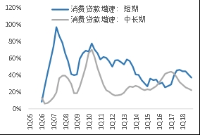 消费信贷在2015-2017年经历了快速的增长,中长期消费贷款增速在2017年中开始放缓,而短期消费贷款增速则在2018年下半年开始放缓。