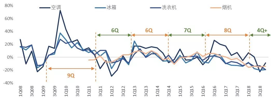 受地产和家电补贴政策两轮推动,2006-2007/2009-2010年是家电行业增速的峰值期,考虑家电的合理使用寿命,这些短期中快速积累的存量家电势必需要在某个时刻对整个行业的需求产生影响。