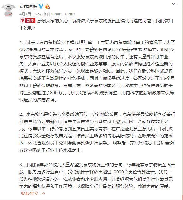 京东物流官方微博在4月7日晚回应称,京东物流独立运营之后,不仅服务京东商城自身的订单,还有大量外部订单业务,大客户业务以及个人快递的揽件业务等等,原来的薪酬结构已经不适应新的模式,因此在部分地区试点将底薪转变成更有激励性的业务提成。关于降低公积金系数,则是在政策允许的范围内,依法合规对员工公积金缴存比例进行调整。