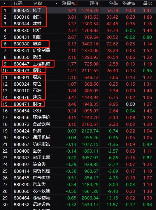 实际上,不只是化工股,钢铁、建材、工程机械、煤炭、有色等周期股也大涨。