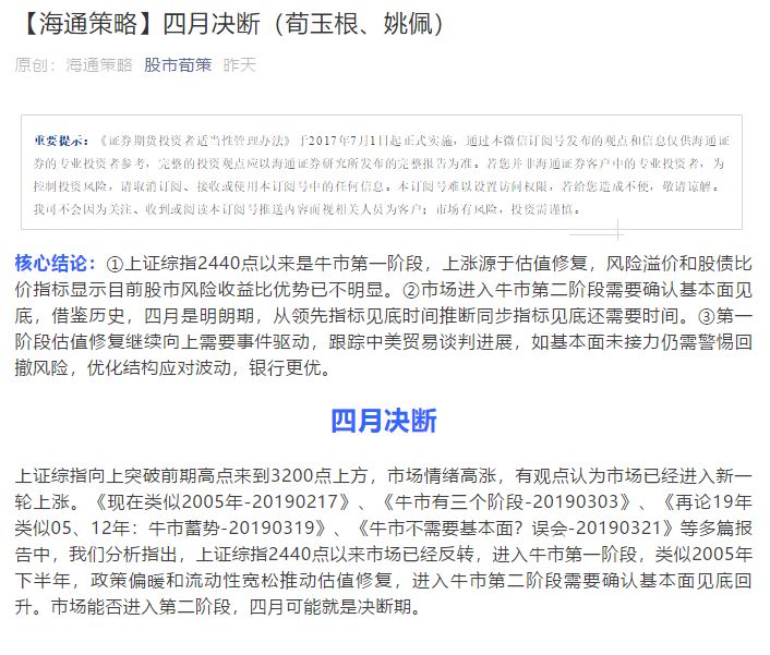 海通证券表示,上证综指向上突破前期高点来到3200点上方,市场情绪高涨,有观点认为市场已经进入新一轮上涨。上证综指2440点以来市场已经反转,进入牛市第一阶段,类似2005年下半年,政策偏暖和流动性宽松推动估值修复,进入牛市第二阶段需要确认基本面见底回升。市场能否进入第二阶段,四月可能就是决断期。