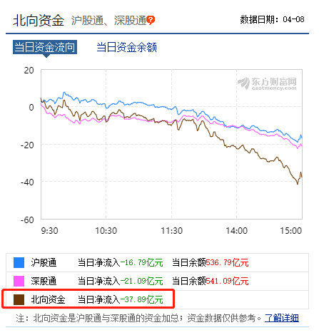 市场下挫,北上资金又在净卖出。截至收盘,北向资金净流出37.89亿元,沪深两市成交额报10670亿元。其中沪股通净流出16.79亿元,深股通净流出21.09亿元。