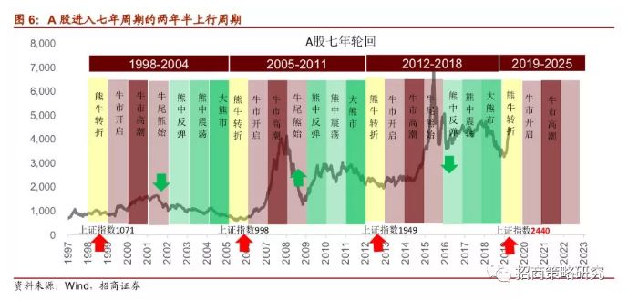 招商证券策略研报指出,在年初撰写的《寄语2019,A股迎来新上行周期起点——A股投资启示录五》中所描述的A股三期叠加,A股迎来七年周期的两年半上行周期的判断,目前得到很好的验证。按照每七年全A指数创新高的规律,我们会在2021年见到比2015年更高的高点。