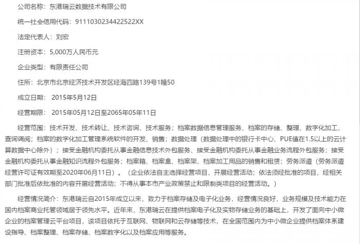 根据东港股份披露的信息显示:东港瑞云自2015年成立以来,致力于档案存储及电子化业务,经营情况良好,业务规模及技术能力在国内档案商业托管领域居于领先水平。近年来,东港瑞云在提供档案电子化及实物存储业务的基础上,开发了面向中小微企业的档案管理云平台项目,该项目依托于互联网、物联网和云存储等技术,在全国范围内为中小微企业提供档案体系建设指导、档案整理、档案存储、档案数字化以及档案应用等服务。