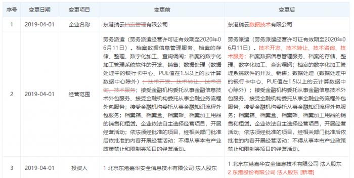 记者根据天眼查的信息发现,4月1日的时候东港股份这家子公司由“东港瑞云档案管理有限公司”改名为了“东港瑞云数据技术有限公司”,公司这一步改名也体现了其想要冲击科创板的野心。