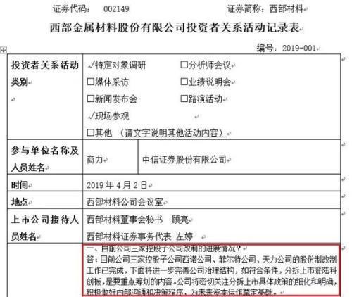 4月4日,西部材料公告,公司日前接受了中信证券调研。西部材料表示,目前公司三家控股子公司西诺、菲尔特、天力的股份制改制工作已完成,将进一步完善公司治理结构,如符合条件,分拆上市登陆科创板是要重点筹划的内容。