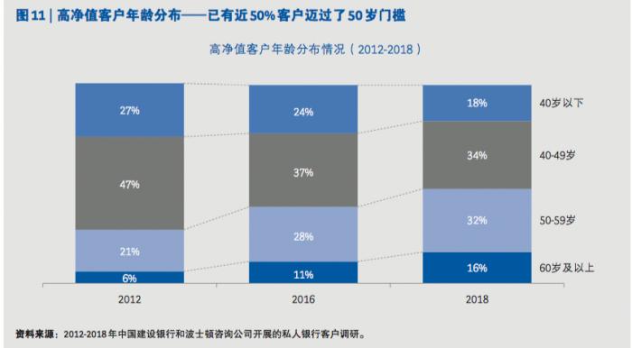 该报告通过对建行 3399 名私人银行客户的综合调研和数据分析,研究发现 “50”成为一个高净值客户特征分布比例的高频词。2018 年调研显示,样本中近半数高净值客户已经迈过了50岁的门槛,这表明高净值人群的主体已经进入了财富管理生命周期的新阶段,其主要的理财需求正由追求财富快速增长转向追求财富健、保值,以及财富的有序传承。