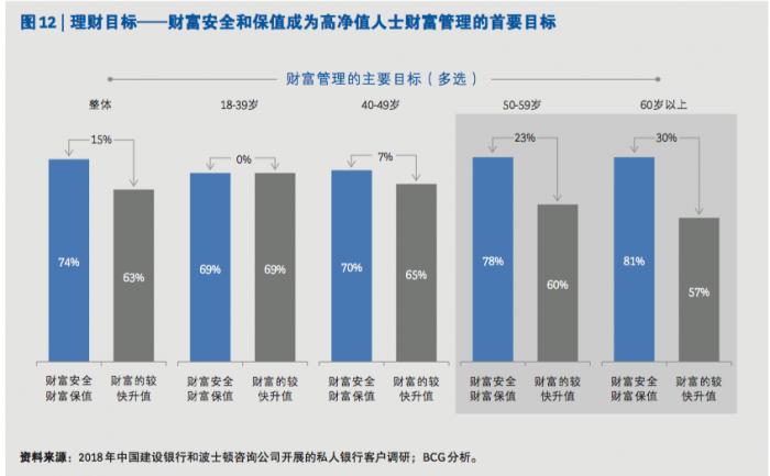 第三,高净值人士的年龄特征转变将长期影响其理财目标。对于年纪较长的高净值客户来说,他们已经走过了最渴望财富快速增值的阶段。在经历了长期的奋斗和财富积累之后,他们在金钱观、人生成就、 社会价值等方面有了更为深入的思考,而财富的进一步增值带来的边际效益已经变得不那么明显。