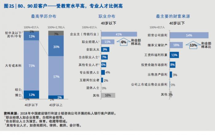 报告显示,轻一代的高净值客群普遍受教育水平更高,86% 的 80、90 后受访人士拥有本科或大专及以上学历,远远超过 40 岁以上的群体。从职业分布 上看,新兴行业创业者、职业经理人和其他专业人才占比显著高于总体样本。80、90 后成 长于互联网发达、全球化的时代,很多客户有海外留学经历,具备较强的国际视野和全球 意识。这些鲜明的客群特征也决定了其财富管理需求的显著差异。