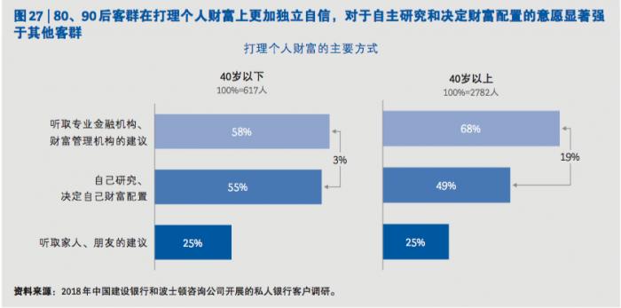 其次,80、90 后客群在管理个人财富方面呈现出较强的自信和自主性。他们往往拥有 更丰富的金融知识,也拥有更丰富的渠道获取关于个人财富管理的信息,在财富管理方式 的选择上显得更加自信,不盲从他人建议,自主研究和决定财富配置的意愿较为强烈。调研显示,80、90 后客群中自己研究、自行决定财富配置的比例达到了 55%。