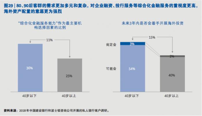 与此同时,80、90后客群对私行服务的需求更加多元和复杂,拥有全球视野。企业服务方面,新生代企业家心态开放,希望获得更多的综合金融运作建议,并乐 于使用新的金融工具帮助其企业更快发展。他们在选择财富管理机构时,对企业融资和投 行服务等综合金融服务的重视程度显著高于其他客群。投资服务方面,80、90 后客户对于 产业基金、私募股权、影响力投资等投资领域显示了浓厚兴趣,对于信托等风险隔离工具 接受度高。他们对于海外资产投资的兴趣也更为浓厚,57% 的 80、90 后受访高净值客户表 示可能或一定会在未来三年内开展海外投资,比例显著高于其他客群。