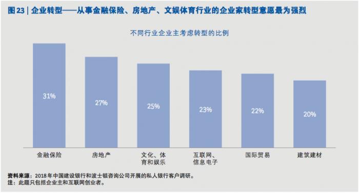 在外部环境影响下,“转型”成为了民营企业家关注的高频词。民营企业家的转型需 求也呈现出了明显的行业和年龄特征。从行业上看,受到监管政策的影响, 从事金融保险、房地产、文娱体育行业的民营企业家转型意愿最为强烈。