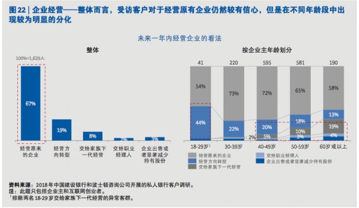 报告显示,民营企业家仍是中国高净值客户群体的绝对中坚力量,在新的市场和监管环境下,第一代和新生代企业家财富管理需求均在发生结构性的变化。比如年轻一代80后、90后高净值人士当中既有通过新的技术、发掘新的商业机遇从而实现个人财富增长的年轻创一代,也有通过继承上一代的财富和产业而崛起的富二代。