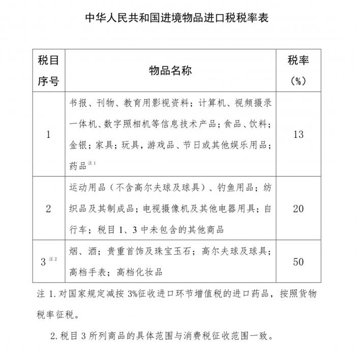自2019年4月9日起,进境物品进口税税目1、2的税率分别调降为13%、20%,税目1“药品”注释修改为“对国家规定减按3%征收进口环节增值税的进口药品,按照货物税率征税”。
