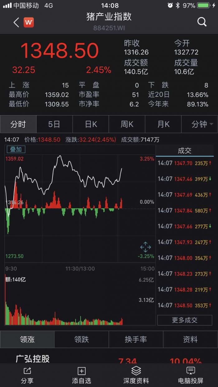 4月8日,截至发稿时,wind猪产业指数上涨逾2%,飙升至1340点,较年初累计上涨88%。