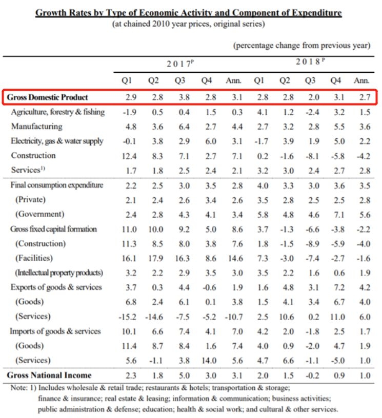 据韩国央行3月5日发布的数据,2018年韩国实际国内生产总值增长2.7%,当年四季度GDP同比增速为3.1%,环比增速为1%,两数值均达到2018年四个季度中的最高。但同时值得注意的是,2018年总的GDP增速仅为2.7%,是六年以来的最低值。