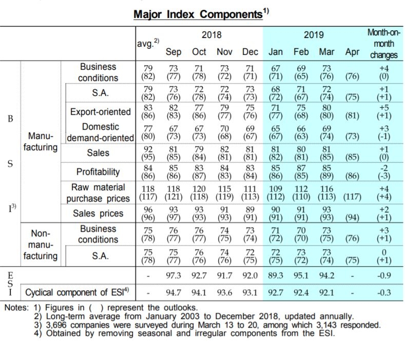 而韩国经济统计处3月28日公布的3月商业调查指数(BSI)和经济景气指数(ESI)显示,韩国3月经季节修订后的BSI为73,环比仅上涨1个点,而ESI也为73,环比不变,其消费调查指数(CSI)为94.2,环比下降0.9个点。