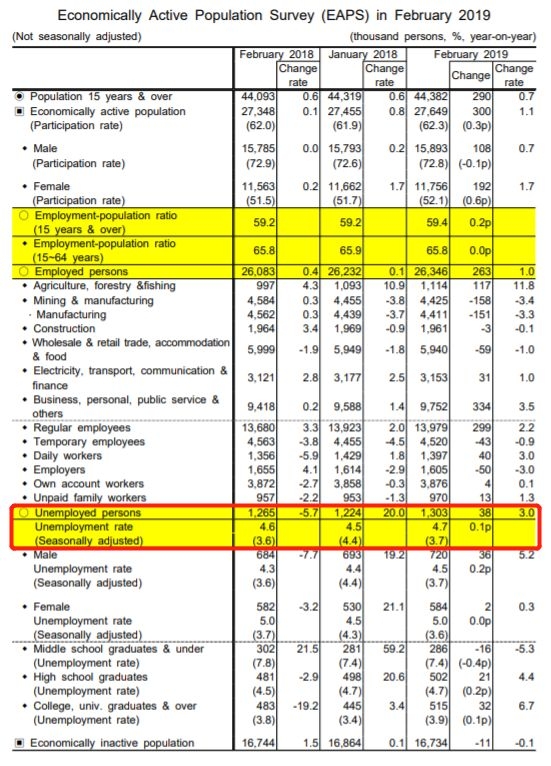 同时,韩国2019年2月的失业率达到了4.7%,比1月上升了0.3个百分点,创九年新高。而美国3月的失业率也只有3.8%,韩国失业率已经超过了美国。