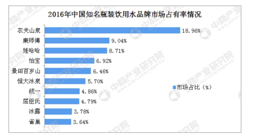 但留给乐百氏的机会不多了,这份报告就指出,在国内的瓶装水竞争市场上:怡宝、农夫山泉、康师傅、百岁山、娃哈哈、冰露六大品牌占据了近八成的市场份额,而这几大品牌市场份额之争从未停止过。数据显示,2016年瓶装水六巨头依次为农夫山泉、华润怡宝、康师傅、百岁山、娃哈哈、冰露。农夫山泉、华润怡宝分别位居第一、第二,两者市场份额之差仅为2个百分点。康师傅、百岁山紧随其后,分别为12.2%、9.2%。