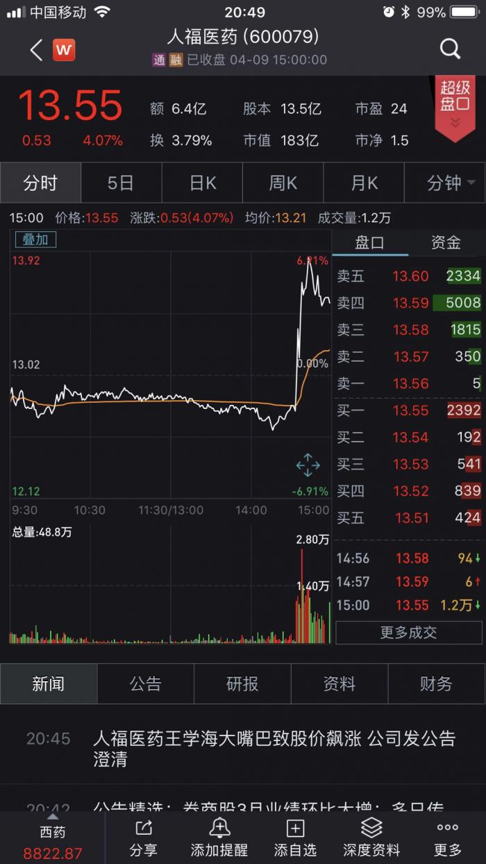 这一消息直接使得人福医药股价在上午低位震荡后直线上扬,由微跌猛冲到上涨4.07%。