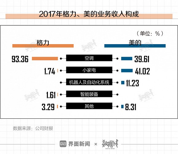 从业务收入构成来看,2017年格力电器93.36%的收入都来自空调业务,而美的收入中空调业务仅占39.61%,41.02%来自小家电业务,剩下11.23%和8.31%分别来自机器人及自动化系统和其他业务。