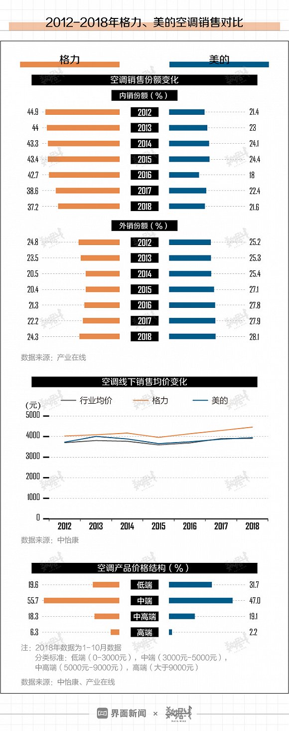 根据产业在线数据,2012-2018年间,格力空调的内销份额一直保持在35%以上,而美的空调的内销份额仅为20%左右。