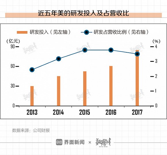在研发投入方面,美的集团2017年研发投入接近90亿元,占其营收3.53%。