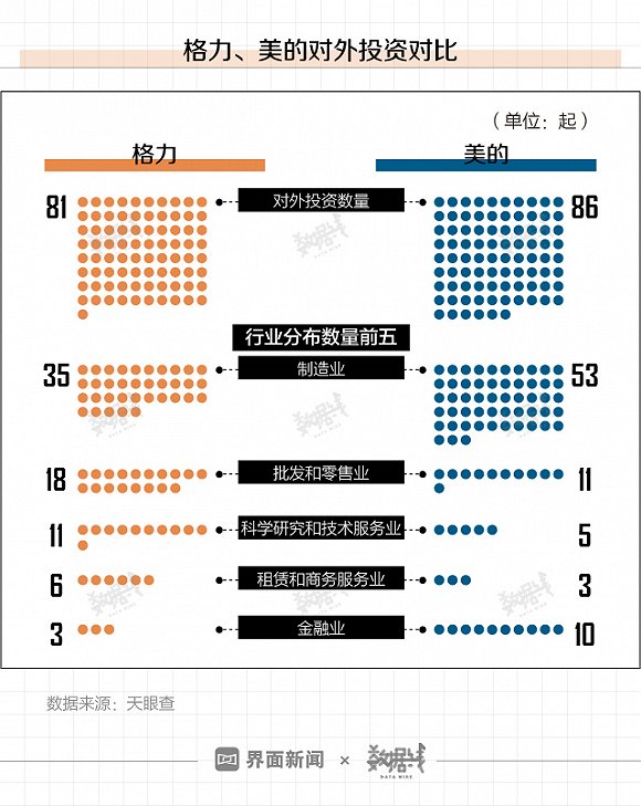 从行业来看,格力电器和美的集团都将投资重点放在制造业、批发和零售业上,此外格力对科学研究和技术服务业的投资数量达11起,而美的对金融业的投资数量达10起。
