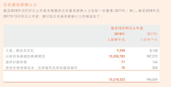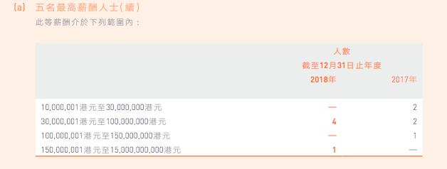 其中,薪酬最高的员工收入是在1.5亿港元(约人民币1.28亿元)至150亿港元(约人民币128亿元)之间,其余四人的薪酬的是在3000万港元(约2567万元)至1亿港元(约8550万元)之间。不过需要注意的是,这百亿薪酬中绝大部分是股权奖励,五人的实际工资加起来是939.8万元。