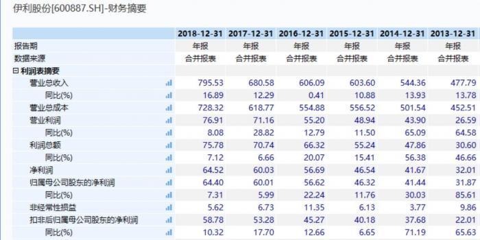 2018年,伊利股份业绩再度实现稳步上升。财务数据显示,去年伊利股份营业收入同比增长16.89%,达到796亿元,距离公司制定的千亿营收目标再进一步;对应归母净利润64.40亿元,同比增长7.31%。
