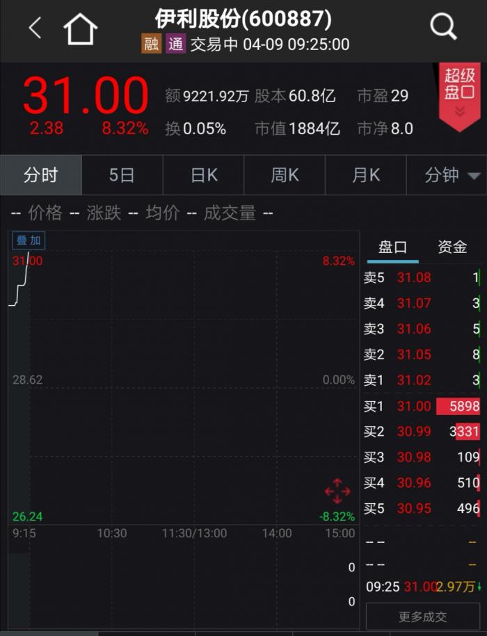 4月9日早间盘前,伊利股份(600887.SH)高开逾8%,截至发稿时暂报30.85元/股。