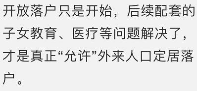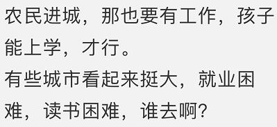 也有读者认为,进城落户的同时,城市配套也要跟上,有些城市看起来大,但就业、读书困难,谁去呢?