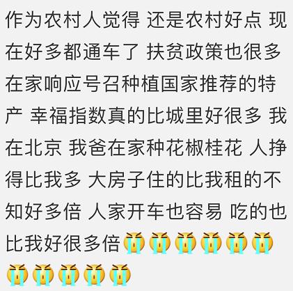 但是,反方观点却认为,事情并没有那么简单。一读者表示,自己居住在北京,但家人在农村,目前很多农村交通状况改善,扶贫政策多,家人在家响应号召种植国家推荐的特产,幸福指数远高于在城市居住。