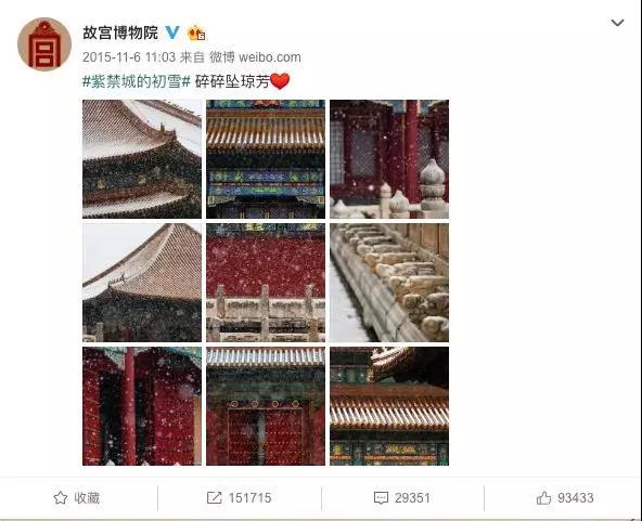 2016年,故宫初雪的热度依旧,照片更加精致唯美,微博的阅读量就达到了1425万,让初雪不再是炸鸡配啤酒,而是故宫走一走。