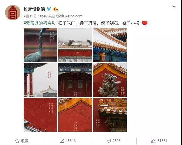 2015年故宫博物馆发布了一条#紫禁城的初雪#的微博,9张图片让大家感受到了红墙陪白雪的静谧之美。