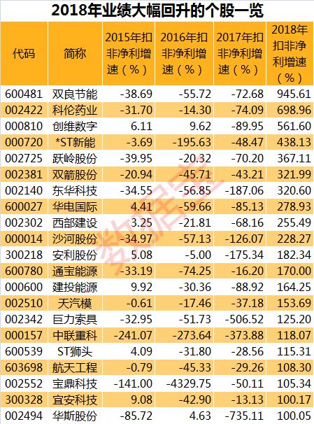 数据宝统计显示,截至今日收盘,沪深两市共有1298家上市公司披露年度业绩,其中有35家公司2015年至2017年业绩持续低迷,而2018年业绩增速迎来了转折。