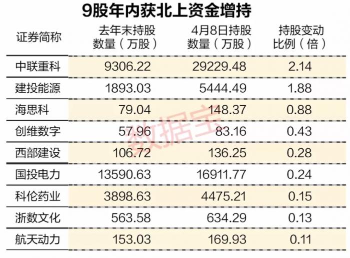 具体来看,中联重科持股数量增幅最大,北上资金对该股的持股数量由去年年末的9306.22万股增加值2.92亿股,持股变动比例高达2.14倍;其次是建投能源,持股数量由去年年底的1893.03万股增加至5444.49万股,持股变动比例高达1.88倍。此外,北上资金对海思科、创维数字2股的持股数量较去年年底分别增加87.7%、43.49%。